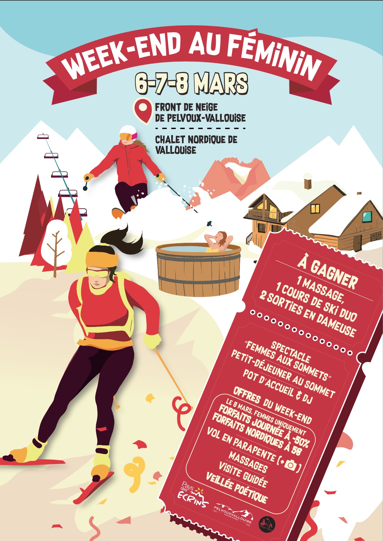 Jeu concours sur les pistes, pot d’accueil et DJ le samedi, petit-déjeuner au sommet et -50 % sur les forfaits alpins le dimanche (offre réservée aux femmes). Pour en savoir plus et connaître le programme détaillé, cliquez ici.